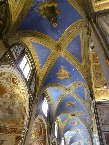 In der berühmten Santa Maria Maggiore kann man gegen den Obulus von einem Euro etwas Licht kaufen und das Deckengemälde in der Apsis bewundern. Hier wird Maria, eigentlich die Mutter Jesus, eher wie eine Braut neben ihm dargestellt. Sie wird von Jesus zur Königin des Himmels gekrönt. In der Cappella Paolina soll in einem Fresko unter der Maria ein ganz besonderer Mond zu sehen sein. Normalerweise wurde Maria immer über einer Mondsichel dargestellt. In diesem Gemälde soll der Mond so gemalt sein, wie Galileo Galilei gerade erst in seinem Fernrohr entdeckt hatte, nämlich als Kugel, mit kleinen Bergen und Tälern drauf. Dummerweise hab ich ausgerechnet dieses Fresko in der ganzen Kirche wieder mal nicht gefunden!