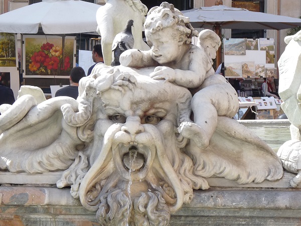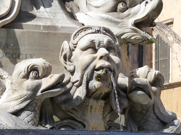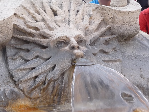Meine Lieblingsfontana ist ein kleiner Brunnen auf der kleinen Piazza direkt vor dem Pantheon. Es ist zwar kein berühmter Brunnen, aber dafür gefallen mir die Figuren am besten. Im Vergleich zu den barrocken, wuchtig- mächtigen Göttern und Engeln anderer Wasserstellen sind die Figuren hier eher lustig, fast sympathisch verschmitzt.